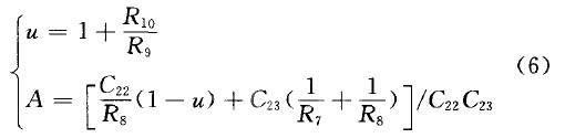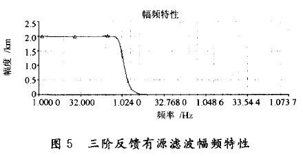 由归一化方法可得,将截止频率fc(Hz)和电容C21都归一化,所以电阻系数为K=100/fcCˊ,Cˊ是以μF为单位的C21值,要使增益G=2时,由文献[6]中表2-54可知。K=1时所对应电阻R6~R10电容C22~C23(μF)的系数分别 2.491,2.339,0.692,11.043,11.043,C21,C21。选择fc=1000,Cˊ=0.01时,图4中 R6~Rl0,C21~C23分别为24.491,23.39,6.92,110.43,110.43,0.01,0.01,0.01。