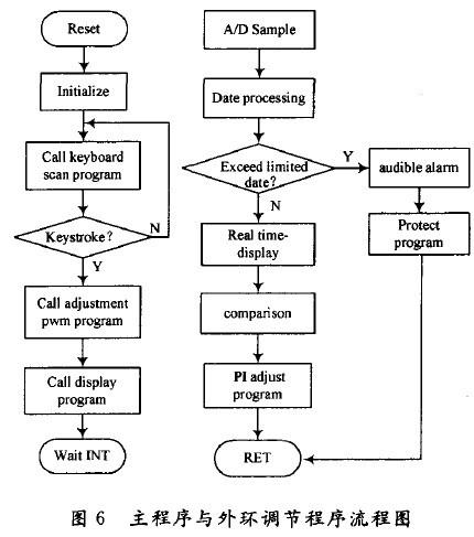 系统的初始化包括DSP外围接口芯片和电流给定的初始化,键盘扫描包括给定和步进量的调整。系统主程序与外环调节程序流程图如图6所示。