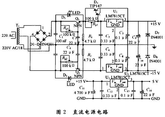 直流电源模块主要由变压、整流、滤波、稳压和“扩流电路”组成。直流电源模块如图2所示。+15V用于“压控恒流模块”和运算放大器供电;-15V用于运算放大器负电源供电;+5V用于数控模块供电。将+5V用高精度、高稳定性的稳压芯片稳压后再为DSP处理器供电。