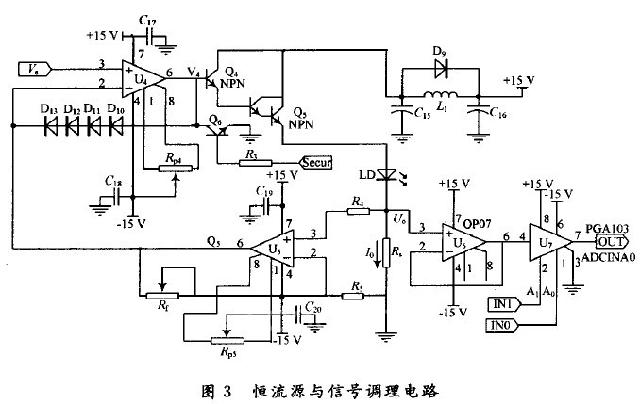 运放U4,U5,电阻Rs,R5,Rf自身的稳定性恒流源的稳定性起决定性作用。因此,U4,U5选用高精度运放OP-27,其漂移仅为0.2μV/℃,其最大噪声电压为0.25μV。R5,Rf选用温漂系数低、精度较高的电阻。采样电阻Rs选用阻值为0.01Ω大功率锰铜丝电阻,其精度为1%。Q5为大功率达林顿管2SD1559,由于集成运算放大器一般工作在小电流状态,因此用一个小功率晶体管Q4(9014)驱动Q5。C15,C16,D9,L1构成低通滤波以减少电源中高次谐波对LD的影响,D5在Q5截止时起到扼制流作用。