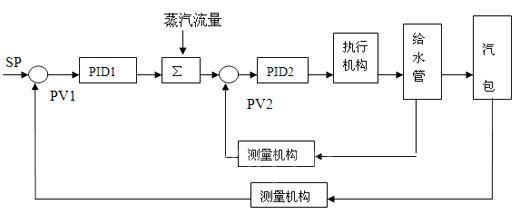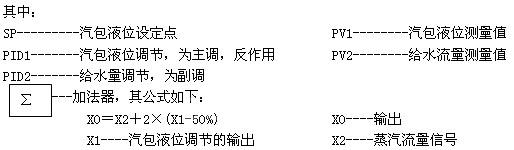 将液位进行PID1调节后输出,和蒸汽流量进行加法运算,其结果作为PID2的设定点,PID2将此设定点与给水流量的偏差进行调节,输出带动执行机构,调节给水阀。