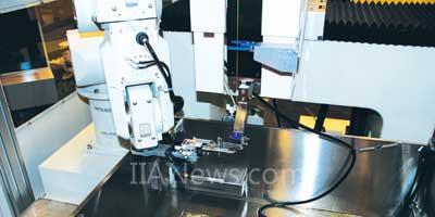 提起EDM孔加工的自动化概念主要有两种方式:一种就是简单的机械式自动换刀装置,另一种就是综合机器人系统。基本上每种方式都具有相同的功能。不过,自动换刀装置仅仅是把刀夹从加工头区域自动移进、移出;而机器人却可以在加工区域将电极、导向器和工件运进运出,前提是要对此进行编程设置。