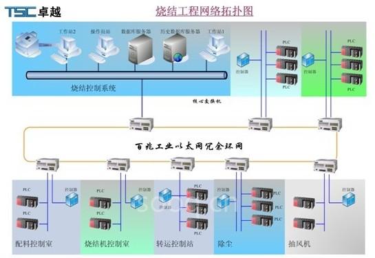 烧结生产流程由原料、二次配料、混合制粒、烧结、冷却、成品筛分等工序组成。此项目中车间是一座现代化的烧结车间,采用了许多先进的工艺设备和技术,基础自动化系统配置由PLC和监控软件组成的控制系统,具有较高的控制水平,而且采用数据库存储历史数据,为将来生产制造执行系统提供数据基础,通信网络采用工业冗余环网技术,为通信提供安全稳定的传输通道。