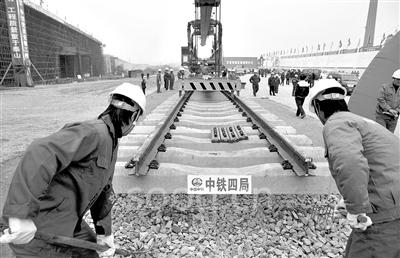 11月18日,铁路建设者在汉宜高速铁路宜昌段施工现场铺轨。当日,汉宜高速铁路开始铺轨。汉宜高速铁路东起汉口,西接宜昌,是我国“四纵四横”铁路主干网络中沪汉蓉高速客运专线的一部分,为国家一级双线电气化铁路,设计时速200公里。该铁路将于2011年底全部竣工,届时坐火车不到2小时便可从武汉到达宜昌。