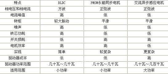 无刷直流电机分为方波控制(120°控制)的BLDC和正弦波控制(180°控制)的PMSM永磁同步电机。下表是各个电机控制特点比较: