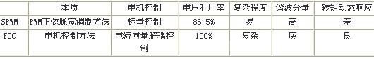 永磁同步电机的180°控制有两种方法:第一种直接输入正弦波进行PWM调制然后使用PID进行控制;第二种是矢量控制(field oriented control, FOC),对永磁同步电机转子磁场解耦控制。下表是180°控制的两种方式的特点