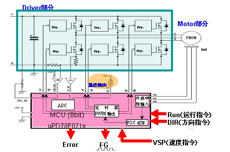 NEC专门为马达变频控制开发了一系列的8位MCU:78K0/IY2、78K0/IA2、78K0/IB2、uPD78F0712、uPD78F0714、uPD789842和uPD780988等。这类MCU和16位机一样集成了内部的硬件乘法器、功能强大的定时器、多个通用寄存器、快速的指令运行系统、可编程脉冲发生器、独立的变频控制模块。这类专有的硬件功能使得NEC的8位MCU相对其他品牌MCU更适合永磁同步电机的180°矢量控制。