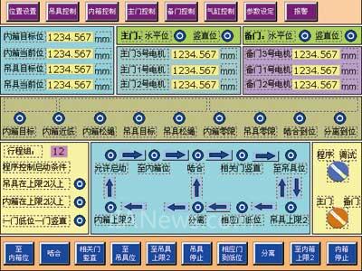 当条件允许满足内箱运动到指定位置即低位,是否到低位由红外开关检测。开关分别装在内箱的4个角上,检测信号进入模拟量模块04AD,用来判断箱子下来的时候是否平直。到低位之后,气缸齿合,相应门竖直后,吊具可以带上物件到指定位置,然后进行回复运动。在传送过程中,要频繁地开关门,由于可能传送一些带辐射的物料,所以运动过程在一个密封罩内进行。