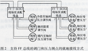 图2所示是支持FF总线的调门和压力测点的就地接线方式。其中传输线是来自OVATION系统DROP6/56的扩展柜背面、EXT6-lPWR3的FF-T-BOX3(+)端和FF-T-BOX3(-)端。