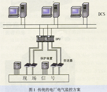 传统的电厂电气监控的实现方式是由DCS系统经I/O板实现对电气部分的数据采集和远方控制。电气部分特殊控制功能如继电保护、故障录波等都由独立的装置来实现,与DCS系统无关。图1为传统电厂电气监控方案,在这个方案中,DCS的I/O板只能处理标准信号,模拟量需要经过变送器转换成标准的4~20mA电流。DCS可以实现对电气中的关键少量的信号的监视和控制,但需要大量的电缆和变送器,实施的成本比较高。