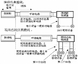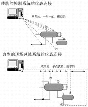 现场总线技术是一种全数字、串行、双向的通讯系统,通过该系统将传感器、执行器与控制器等“现场”设备互相连接起来。典型的现场总线安装就是提供一个现场设备到主机的网络连接,这个连接是双向的、串行通讯连接。这种连接是用一对线将多个现场设备并联在一起,这与传统的4~20mA设备用单独的不同对线连接每一个设备到DCS系统有非常大的区别。下图展示了这点不同: