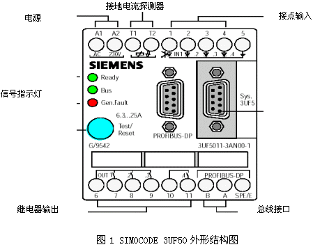 西门子公司的西门子电动机保护和控制-分散式外围设备(SIEMENS MOTOR PROTECTION AND CONTROL DEVICE—DECENTRALIZED PERIPHERALS) - SIMOCODE 3UF系列就是其中的代表,其3UF 10/20在全世界已经有五年以上应用经验,在SIMOCODE-DP系统中可以监视所有重要数据,如电动机电流、运行时间、起动次数等,并通过PROFIBUS-DP网络迅速传到控制中心,实现快速诊断和控制。这些功能不需任何附加计算附件,因此减少了在开关柜中所需的安装空间。还可以运用其内置的定时器、计量表和真值表更改多种电动机控制功能范围,如反向、滑阀控制等。2002年莱城发电厂#3#4机组成功的应用了SIMOCODE 3UF50智能控制器,对现场400V以下电动机进行控制,取得了很好的使用效果。SIMOCODE 3UF50外形结构如图1所示: