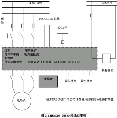 SIMOCODE 3UF50是以经多次试验证明可靠的3UF10/20为基础的,它具有四路8A、AC250V触点输出和四路光隔离信号输入功能,可以通过扩展模块实现另外四路输入和四路输出。控制器有两个串行接口,一个用于PROFIBUS-DP现场总线连接,实现通讯组网;另一个用于手持编程器或操作显示模块连接,用于控制器的参数设定和操作监视。控制器具有0.25A-820A的额定电流范围,可减少产品选型的不便,从而节省了备件成本. 控制器辅助工作电源分AC230V、DC24V 两种,可采用电缆串孔连接方式和母线连接方式两种接线方式,可导轨安装和固定安装。对于PROFIBUS -DP连接到基本单元的系统,总线终端使用带内置总线终端电阻的标准9针SUB-D插头,特别是采用MCC抽出单元设计的,可设置带有内置电源的总线终端模块,以确保总线内最后单元抽出或损坏情况下,对总线数据流不造成影响。SIMOCODE 3UF50接线方式如图2所示: