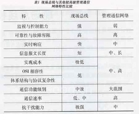 现场总线处于信息/控制网络最低层,虽然传输信息量不是很大,但要求实时性好,可靠性高,而且网络接口尽可能简单,成本尽量降低。现场总线与其他较高级管理通信网络特性的比较见表1。