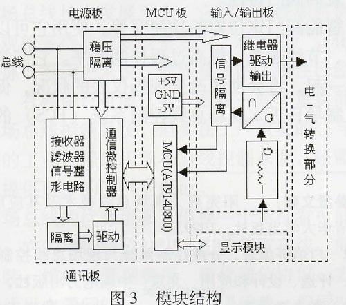采用模块化的设计思想,将整个设计分为功能相对独立的五个模块:电源板、通信板、MCU板、输入输出板和显示板。其中电源板、通信板、MCU板和显示板是通用的。在设计诸如温度变送器、现场总线-电流转换器等其他基于WorldFIP现场总线协议的智能仪表时,这些相对独立的模块可以不加任何改动直接使用,从而缩短开发周期。总体结构如图3所示。