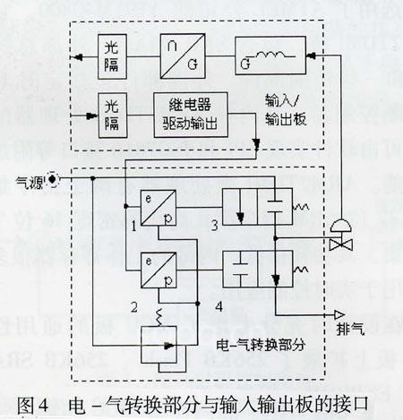 非接触电感位移传感器检测阀门的位移大小,通过转换器经隔离后将其送入微控制器。微控制器将其与设定值进行比较,根据它们的偏差来决定开/关阀3和4的状态(开或关),从而向调节阀进气或从调节阀排气,实现调节阀的精确定位。任一时刻开关阀3和4,只能有一个开通,另一个关闭。开关阀3开通时,压缩空气迸入调节阀;开关阀4开通时,调节阀气室内的压缩空气进4排入大气。电-气转换部分与输入输出板的接口如图4所示。