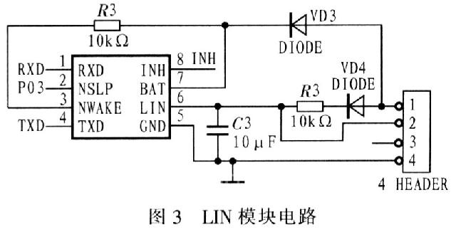 选用TJAl020作为LIN收发器,TJAl020是LIN主/从协议控制器和LIN物理总线之间的接口,主要用作于车辆副网络。其波特率为2.4~20 Kb/s。控制器在TXD管脚输入的发送数据流通过LIN收发器转换成LIN总线信号,并由收发器控制转换速率和波形,减少极低的电磁发射(EME)。LIN总线的输出管脚通过一个内部终端电阻拉成高电平。收发器在LIN总线的输入管脚检测数据流并通过管脚RXD发送到微控制器。TJAl020的主要特点是: