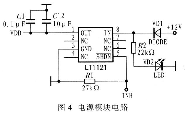 本设计中,LIN模块的电压调节器均采用微功耗、低压差稳压器LTll2l一5。选用LTl121—5通过对SHDN输入低电平,能使其进入停止模式,这时静态电流只有16μA,因此在总线上没有活动时,就能达到减少功耗的目的;此外,该器件还具有防止输入和输出电源反向的功能,即使在输出端不增加二极管的情况下,也能防止电流反向倒流。图4给出电源模块电路。