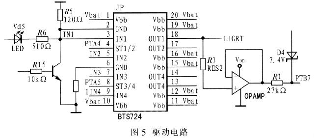 采用功率驱动器BTS724G来驱动2l W和5 W的车灯。该驱动器是英飞凌公司设计的N沟道MOSFET功率管,内部集成了充电泵、电流驱动,并具有检测负载电流(包括过载、过温和短路)故障反馈功能。BTS724G采用12 V或24 V负载控制,适用于各种阻性、感性或容性负载,尤其适用于车灯等具有高浪涌电流的负载,可作为继电器、保险丝等的替代控制方法。BTS724G还具有短路保护、过载保护、过压保护、过温关断、掉地和掉电保护、静电放电保护和电源反接保护等多项保护功能。图5给出驱动电路。
