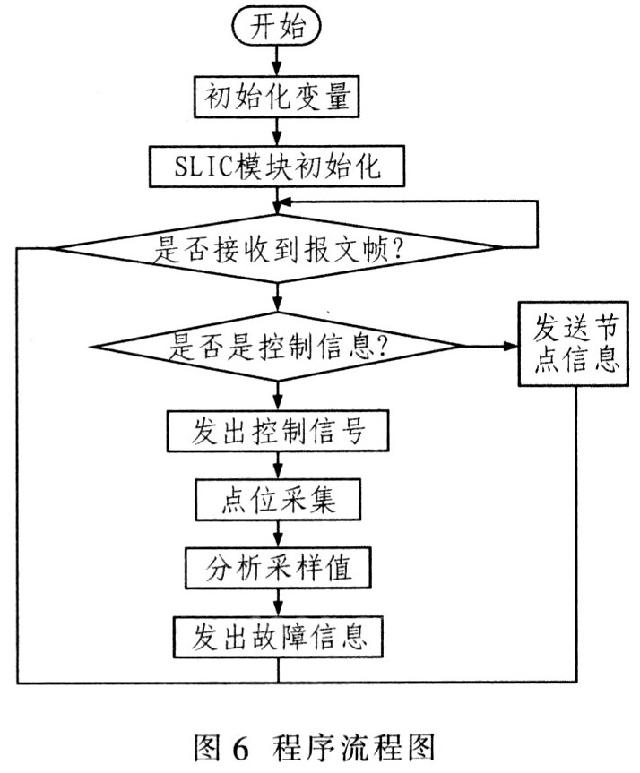 LIN信息的接收采用中断方式,当MC68HC90—8Q14控制器检测到符合该节点要求的信息帧后,首先判断本地节点接收到的是什么信息帧,若为控制信息,则接收2个字节的数据信息;若为查询信息,则将本地节点车灯的状态以信息帧的形式发送回主节点,以反映节点情况。然后判断,若为接收数据帧,则在SLIC模块中的数据寄存器(SLCDx)上读取相应的信息。最后是根据数据信息中相关的位进行车灯控制,在发出控制信号后地相应采集车灯驱动芯片输入、输出和故障诊断引脚的电位,通过对电位的分析判断否发生故障,若发生故障则发送一个故障信息。图6给出程序流程图。