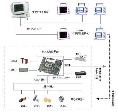 我们以多参数监护仪为例,来看一看“EVOC”嵌入式智能平台在医疗仪器行业的应用。系统一般由多台监护仪和一台中央护士工作站组成,监护仪采用“EVOC”104-1541CLDN型全功能嵌入式工业主板为核心操作平台。该主板仅有手掌的一半大小,板上集成了超低功耗的NS GX 300MHz CPU处理芯片、 SDRAM、CRT/LCD控制、10/100Mbps网络接口、Compact Flash、IDE、FDD、两串一并、二个USB、一个115Kbps IrDA红外接口、1~255秒可编程看门狗定时器、PS2 键盘和鼠标,支持目前国内医疗行业最通用的PC/104接口,系统通过该接口扩展的用户板完成包括血压、血氧、体温、呼吸等一系列传感探测器的信号采集,进行实时处理,最后结果可经由多种形式输出。目前该平台支持高精度LCD和VGA两种显示模式,在板视频最大分辨率可达1024*768,支持通用的热敏打印接口,并可通过标准串口与中央护士工作站相互通讯。在平台操作系统的选择方面,我们给予客户更多的自由度,打破了传统多参数仪仅支持单一DOS操作系统的局限,以提供更加灵活广泛的应用模式。