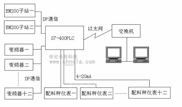 系统采用西门子S7-400 PLC作为下位机,PLC与两个EM200子站、12台西门子MM440变频器通信,采集、处理现场数据和简单的控制。PLC用CP443以太网模块和上位机进行通讯以交换系统运行数据。组态软件使用世纪星组态软件设计的组态界面如下:首页封面、登录界面、设备操作界面、配料设定界面、配方界面、实时数据界面、报表界面、系统诊断界面等。