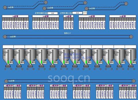 4.2 设备操作界面是上料5条皮带输送带及配料12台配料秤及1条下料皮带输送带的形象画面,能实现自动、手动操作及检修选择。自动时,系统自动控制上料及配料动作。手动时,操作员手动控制设备的启停操作,具有连锁功能。检修状态是供检修时使用,系统不对设备进行控制,所有控制行为均由现场操作完成,没有连锁功能。