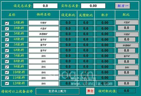 4.4 配方界面使用世纪星的配方功能,配方存储数量没有限制。选仓功能,选中下料料仓和料种并输入配料总量,系统根据选择情况和配方自动计算下料量,计算结果显示在配料设定界面并储存,数据最后提供给报表。