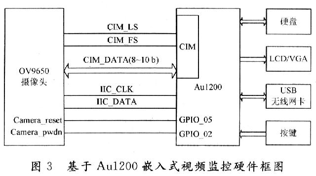 (1)视频监控输入部分:采用Omni Vision公司的彩色CMOS图像传感器OV9650作为系统的视频输入设备,利用Au1200自带的CIM(Camera Interface Module)接口,可以方便地控制OV9650。通过I2C方式,配置OV9650摄像头的工作模式,通过CIM接口读入采集到的视频数据,并映射到内存单元中。根据不同流向需求,处理视频数据流,实现系统的录制、存储、播放、传送等功能。