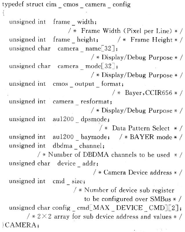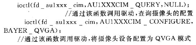 其成员函数分别完成了与Au1200 CIM接口相连摄像头设备的打开、控制、读写、映射以及释放等基本功能。例如通过ioctl操作对摄像头进行配置: