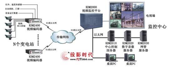 监控中心可同时监控所有的远端变电站,主要部署了KDM2000视频监控平台、KDM2010中心控制服务器、KDM2020数字录像服务器、KDM2030网管服务器和电视墙设备。KDM2000是一台嵌入式模块化的大型监控平台,与普通的PC监控平台不同,其可直接支持112个E1或者448个2Mbps以太网码流的接入。远端变电站的KDM2400通过E1或者以太网方式统一接入到KDM2000,由KDM2000负责码流的转发和处理。KDM2000可内置多路视频解码模块和多画面分割模块(最多16画面分割),通过与电视墙或者大屏幕显示设备的配合,可让监控中心同时监控多个变电站的画面,并可进行轮询监控。系统中还配置了三台服务器,其中KDM2010中心控制服务器主要负责远端监控点的摄像头、云台等外设的控制和告警信号的输入/输出控制等功能;KDM2020数字录像服务器负责提供数码录像和视频点播功能,当系统要求录像的存储时间比较长时可采用超大容量的磁盘阵列替代;KDM2030网管服务器负责整个网络的全程网管,可在监控中心实时观看网内所有KDM设备的运行状况和设备告警信息。