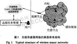 无线传感器网络是一组传感器以Ad Hoc方式组成的有线或者无线网络,其目的是协作地感知、采集和处理传感器网络所覆盖的地理区域中感知对象的信息,并传递给观察者。这种传感器网络集中了传感器技术、嵌入式计算机技术和无线通信技术,能协作地感知、监测和采集各种环境下所感知对象的信息,通过对这些信息的协作式信息处理,获得感知对象的准确信息,然后,通过Ad Hoc方式传送到需要这些信息的用户。用于传感器网络的传感器与一般概念的传感器不同,它除了能够感测被测物理量的变化并输出相应的变化信息外,还要具备远程通信功能,必须是一种智能型的传感器。另外,要完成通信功能,除具有敏感元件外,还必须具有电源、嵌入式微处理器、存储器、数据传输通信部件等。图1是典型的传感器网络结构图,它包括传感节点(sensor),观测节点(sink)和基站等。