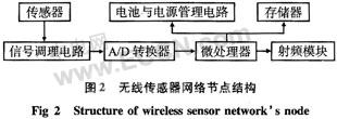 无线传感器网络的基本组成元素是节点,在不同的应用中,传感器节点设计也各不相同,但它们的基本结构是一样的。节点的典型硬件结构如图2所示,主要包括如下几个单元:传感单元(由传感器和模数转换功能模块组成),处理单元(由嵌入式系统构成,包括微处理器、存储器、信号调理电路等)、通信单元(由无线射频模块组成),以及电源部分。此外,可以选择的其他功能单元包括:定位系统、移动系统以及电源自供电系统等。