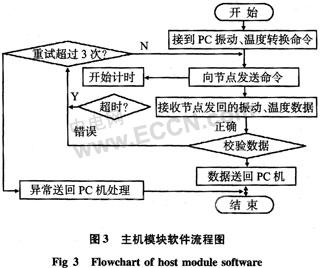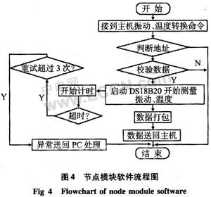 网络层采用TEEN(threshold sensitive energy efficientsensor network protocol)协议。该协议为响应型传感器网络协议,只是在被观测变量发生突变时才传送数据。由于传感器节点的能量有限,且不便补充,故使用该协议可有效地节约能量,延长网络寿命。另外,在监狱安防系统中,只有当振动和温度数据产生突变时,才需要传输数据,而持续的以恒定速率发送监测数据给sink节点对于监狱安防系统来说是不必要的。图3、图4分别为主机模块软件流程图和节点模块软件流程图。