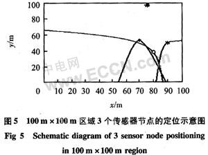 如图5所示,假设3只传感器节点分布在100 m×100m的区域。图中,o代表目标实际位置,*代表传感器节点位置,+号代表计算得到的目标位置。