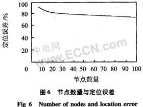 在100m×100m的正方形仿真区域中,随机均匀分布一定数量的节点,10,20,……,100,每个节点具有相同的通信距离10m,其中,有5个簇首节点。图6所示是DV-Hop定位算法在随机选取锚节点的情况下的定位误差。仿真结果表明:随着传感器节点数目的增加,定位所产生的误差减小。因此,在实际应用中,可以在综合考虑成本的基础上,适当的增加动态监测系统中传感器节点的数量。