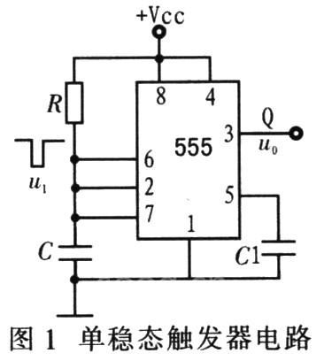 电路中只有一种稳定工作状态的触发器叫做单稳态触发器,其特点:在无外加触发信号作用时,电路处于一种稳定工作状态,称为稳态;当输入端有外加触发脉冲信号的上升沿或下降沿(由电路而定)作用时,输出状态立即发生跳变。电路进入暂时稳态状态,称为暂稳态。电路自动恢复原先的稳态,其暂稳态时间与电路阈值电压及外接R、C参数有关。按电路结构,单稳态触发器可分为微分型和积分型两种。前者适用于窄脉冲触发,后者适用于宽脉冲触发。无论哪种电路结构,其单稳态的产生都源于电容的充放电原理。图1为用555定时器组成的单稳态触发器电路。