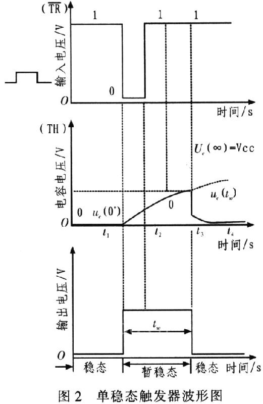 用555定时器组成的单稳态触发器,图2为其波形图。图中,t0~t1为稳态,t1~t3为暂稳态,t3时刻恢复稳态。