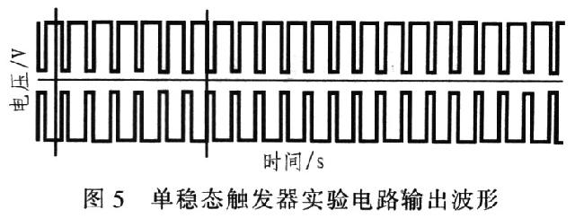 图4为仿真单稳态触发器实验电路,图5为示波器输出波形。在图4的电阻、电容取值下,移动示波器的1、2两个游标测得暂稳态的维持时间为550.702 1μs,利用公式计算:TW=1.1RC=550μs,实验结果与理论计算结果基本一致。