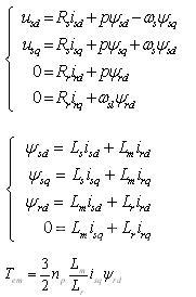 异步电机本质上是一个高阶、非线性、强耦合的多变量系统,由于电机内部各个量的耦合性的存在,直接控制电机的三相输入电压电流的方法得到的结果并不令人满意。经过合适的坐标变换,电机内部电流将会得到解耦,电机的模型将被大大简化。在常用的磁场定向矢量控制系统中,一般使d-q坐标系中的d轴与转子磁场方向重合,此时转子磁通q轴分量为零,在此坐标系内电机模型如下: