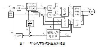 由上面矢量控制的原理可知,异步电机的矢量控制系统就是先对实际电机的三相坐标系下的物理量进行变换,在变换后的坐标系下对电机的磁链和转矩分别控制,确定控制给定量,然后再经过反变换变换至实际三相坐标系系统对电机进行控制的过程。针对前面所提到的矿山机车牵引电机的工作特点,应该在传统的矢量控制中加入转速估算和弱磁控制环节。综合考虑矿山机车系统的特殊要求本系统结构框图如图1所示。