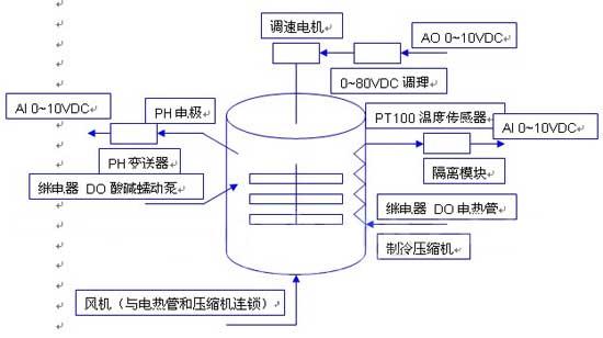 1.系统概述: 智能式生物发酵系统要求强大的自动控制功能、可扩展性强、操作灵活、稳定可靠以及故障率低。基本控制参数为:温度、搅拌速度、PH、DO、进气流量、罐压、定时定量流加、连续发酵、液位、多种自动补料方式、自动消泡等。特殊分析、控制为:如CO2、密度、糖份、自动灭菌等。 2.系统组成: 1. 发酵罐 玻璃、不锈钢 2. 控制系统 (1)可编程控制器(整个控制系统的核心组件) (2)传感器: 温度传感器、PH值传感器、容氧传感器、压力传感器 (3)变送器: 4~20mA变送器(起到信号变送的作用) (4)现场执行设备 变频器: 控制电机,由AO输出控制 交流电机: 控制压缩机,由变频器控制 蠕动泵: 控制酸碱的加入,由AO输出控制 3. 本地控制 (1)5.7寸或10.4寸工业级人机界面,现场显示、操作终端 (2)本地监控程序,在触摸屏中运行 4.远程监控 (1)PC电脑 (2)上位组态软件 5.其它 (1)电源(2)报警装置 结构图: