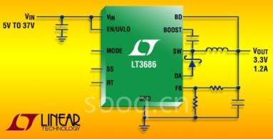 凌力尔特公司推出 1.2A、37VIN LT3686。LT3686 在 3.6V 至 37V 的 VIN 范围内工作,具有过压闭锁功能,可保护稳压器和负载免受高达 55V 瞬态的影响,非常适用于汽车应用中常见的负载突降和冷车发动情况以及 24V 工业电源。其内部的 1.85A 开关在电压低至 0.8V 时可提供高达 1.2A 的连续输出电流。其低的最短接通时间使该器件能够提供高开关频率,即使在高降压比时也是如此。例如,输入高达 16V 时,它可以利用一个 2MHz 的开关频率提供 3.3V 输出。LT3686 的开关频率从 300kHz 到 2.5MHz 是用户可编程的,从而使设计师能够最大限度地提高效率,同时避开关键噪声敏感频段。LT3686 还运用一种独特的设计,该设计确保 LT3686 保持恒定频率切换 (甚至在非常轻的负载情况下)。该器件的 3mm x 3mm DFN-10 封装和高开关频率 (允许使用小的外部电感器和电容器) 提供了一个占板面积紧凑和高热效率的解决方案。