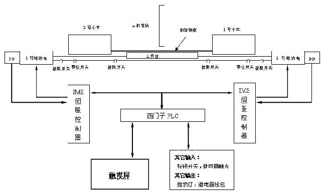 推料小车驱动电机有IMS伺服控制器进行位置控制,通过编码器(PG)构成位置闭环系统,所有的位置开关,零位开关 ,所有的使能信号直接联入相应控制器的接口作为控制信号。控制器利用内部PLC功能通过I/O信号和RS422通信对参数的接收和相应的处理。内部PLC作为一个智能从站,对编码器反馈的速度位置及时地反映到触摸屏上。自身控制的部分功能自己诊断处理。故障保护:IMS伺服控制器把历史故障和实时故障,反映到触摸屏显示。电机运行中的实时数据如转矩,电流,电压,速度,位置。都在第一时间反映到人机界面。用户由触摸屏设定的技术参数同通过RS422传送到IMS伺服控制器去做处理。这样由PLC控制的多数据高精度定位控制就可以实现了。制管成型机示意见图1。