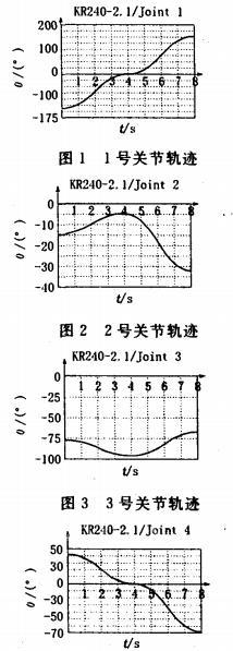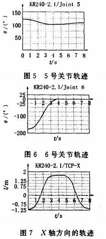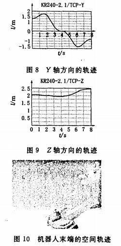 本文以KUKA240—2型搬运机器人为研究对象,对机器人的运动采用DELMIA/IGRIP进行了分析,得到机器人各关节的轨迹,如图1~图6所示,机器人末端的运动轨迹,如图7~图9所示,机器人末端的空间轨迹如图10所示。