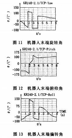 恨据机器人工作的特点,一般把饥器人各关节的轨迹,机器人末端的轨迹和机器人末端的位姿作研究对象,创建测量曲线,进行运动学仿真分析。产生测量曲线的方法:点击“SimulationAnaly—sis"Fools”中的“DataReadout”;在弹出窗口点击“Sensors”按钮,并选择相应的机器人;在弹出的“Sensormanagement”选择需要测量的曲线,如各关节的轨迹、机器人末端的轨迹、机器人末端的位姿等;对机器人进行仿真,在“SpreadSheet”得到需要测量的一系列数值,点击“Graphics”便得到所要的各个曲线。我们也可以在 “Customizedcurves”来绘制其它关系曲线。