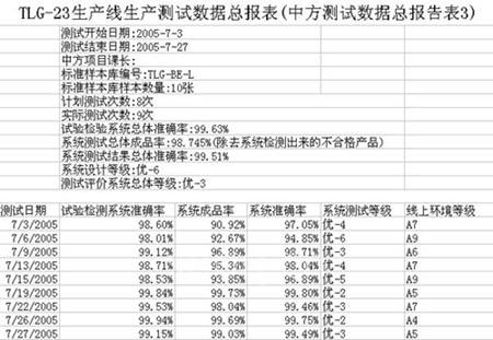 在生产线的工业网络上还有其它自动化生产设备,CVS和PXI构成的检测系统可以和它们无缝连接,在整个的测试过程中可以保证实现实时在线检测,这样不仅省去了以前耗时复杂的检测过程,大大的提高了生产效率,目前TLG-23的产量由以前的单生产线100张/天提高到了835张/天。同时检测的准确率也大大提高,图3是近期的生产测试报告,从检测的结果分析其完全符合实际生产需要,达到了设计要求。