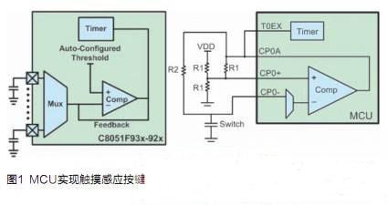 具体测量方式有两种:一是可以测量频率,计算固定时间内张弛振荡器的周期数。如果在固定时间内测到的周期数较原先校准的为少,则此开关便被视作为被按压;二是可以测量周期,即在固定次数的张弛周期间计算系统时钟周期的总数。如果开关被按压,则张弛振荡器的频率会减少,则在相同次数周期会测量到更多的系统时钟周期。C8051F9xx MCU系列,可通过使用芯片上比较器和定时器实现触摸感应按键功能,连接最多23个感应按键。而且无须外部器件,通过PCB走线/开关作为电容部分,由内部触摸感应按键电路进行测量以得知电容值的变化。与C8051F93x-F92x方案相比,唯一所需的外部器件是(3+N)电阻器,其中N是开关的数目,以及3个提供反馈的额外端口接点。