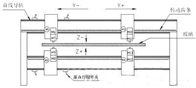 此设备用于玻璃的钻孔加工,如图1所示,整个机加上有两根平行的横梁,两对钻轴分别安装在由4个位置电机带动可左右移动的固定板上,每块固定板分别由固定在横梁上下的两个直线导轨滑块与固定板连接在一起,钻轴的左右移动由固定在固定板上的位置电机M1,M2,M3,M4通过齿轮齿条带动钻轴沿Y方向左右移动。每个钻轴的内部由两个电机组成,靠近钻头的电机(M7,M9,M11,M13)带动钻头旋转。钻轴的另外一个电机(M6,M8,M10,M12)通过电机内部的丝杠螺母副将电机转子的旋转运动转换为轴向升降运动,带动钻头作上下进给运动,即Z向运动。玻璃定位时首先由X方向定位装置(此装置在图中未画出,其方向为垂直于纸面的方向,装置的运动由X方向位置电机M5驱动)将玻璃推至准确位置,各钻轴沿Y方向移动至正确位置,下钻头上升,开始钻玻璃的下平面,钻至设定的深度,下钻头退回,然后上钻头下降钻玻璃的上平面,钻至设定的深度后退回。此设备可同时对两个孔进行加工。
