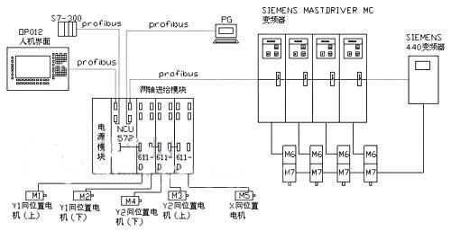 以NCU572为核心,电源模块采用SIMODRIVER 611D,电源模块主要为NCU和给611D数字驱动提供控制和动力电源,产生母线电压,同时监测电源和模块的状态。后面有三个进给模块通过驱动总线接口与NCU572挂接,数控和驱动的接口信号为数字量,分别驱动两对钻头的Y方向位置电机(M1,M2,M3,M4)和X方向位置电机M5。同时NCU572又通过PROFIBUS现场总线与OP012人机界面、S7-300PLC及控制电机转速的变频器连接在一起。